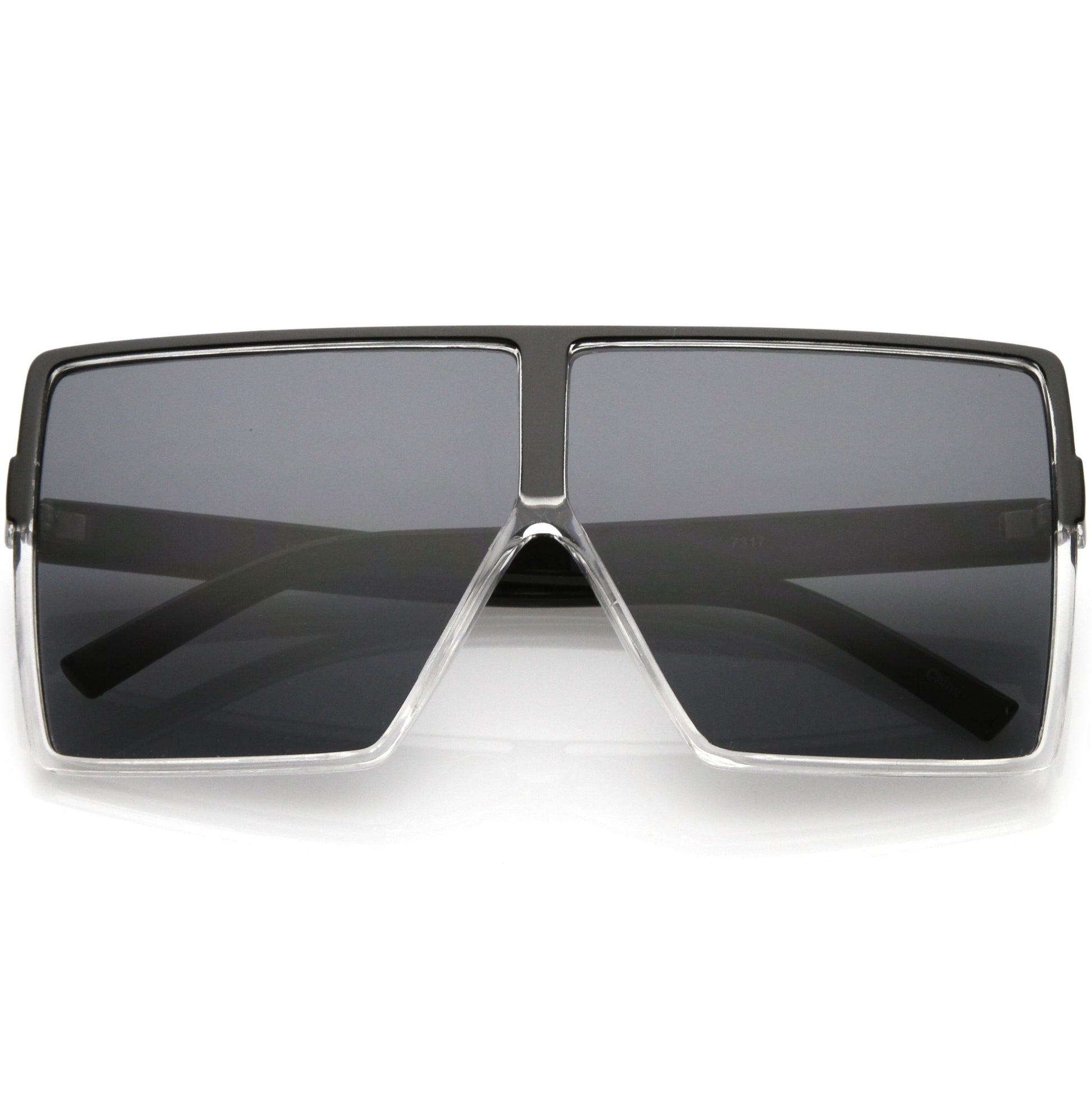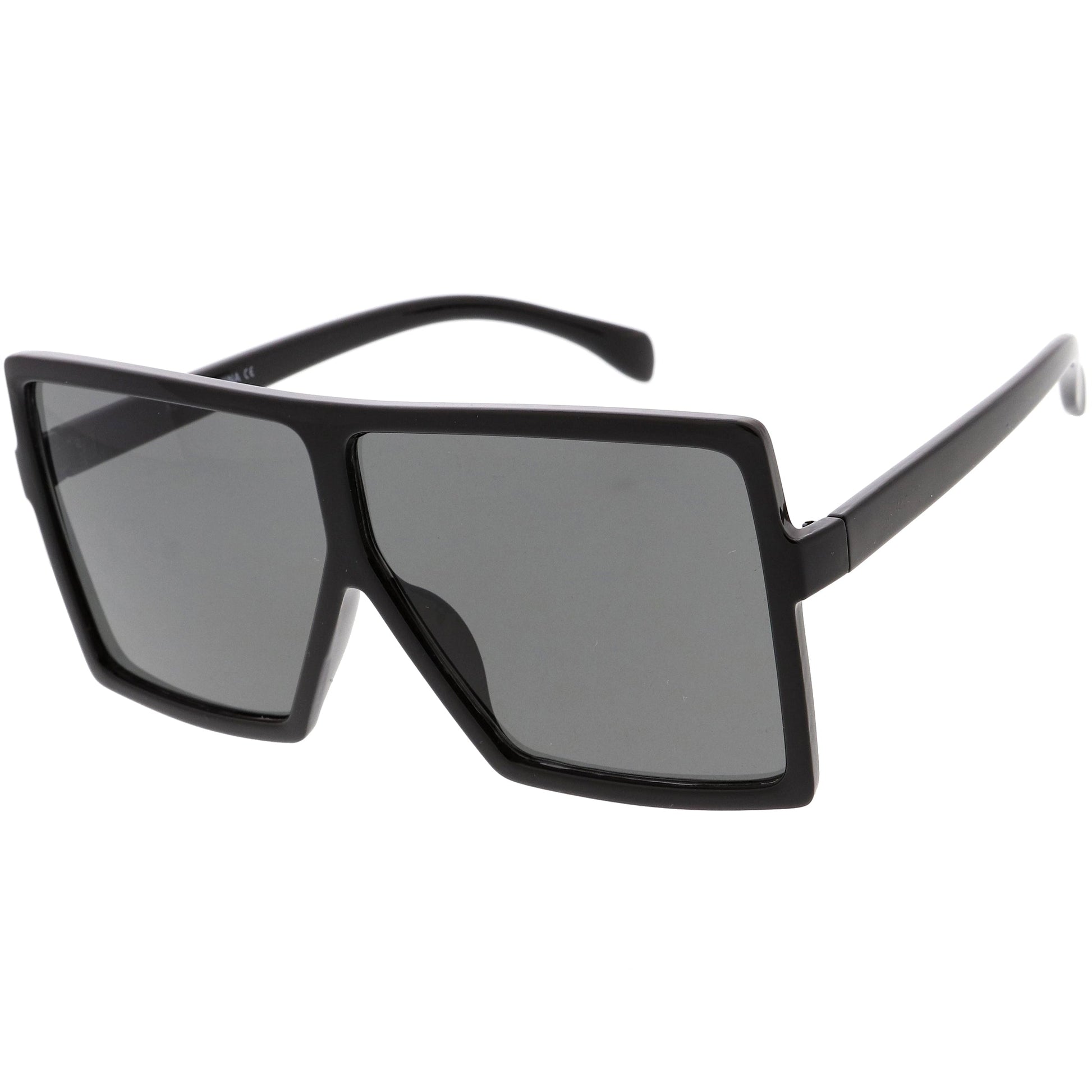 - Super oversize square sunglasses. This style is made with an ultra-flat top and square design, giving it a little edge. Choose between four different neutral colored flat lenses to add to your accessory closet. Finished with a plastic based frame, metal hinges, and 100% UV protected lenses.
