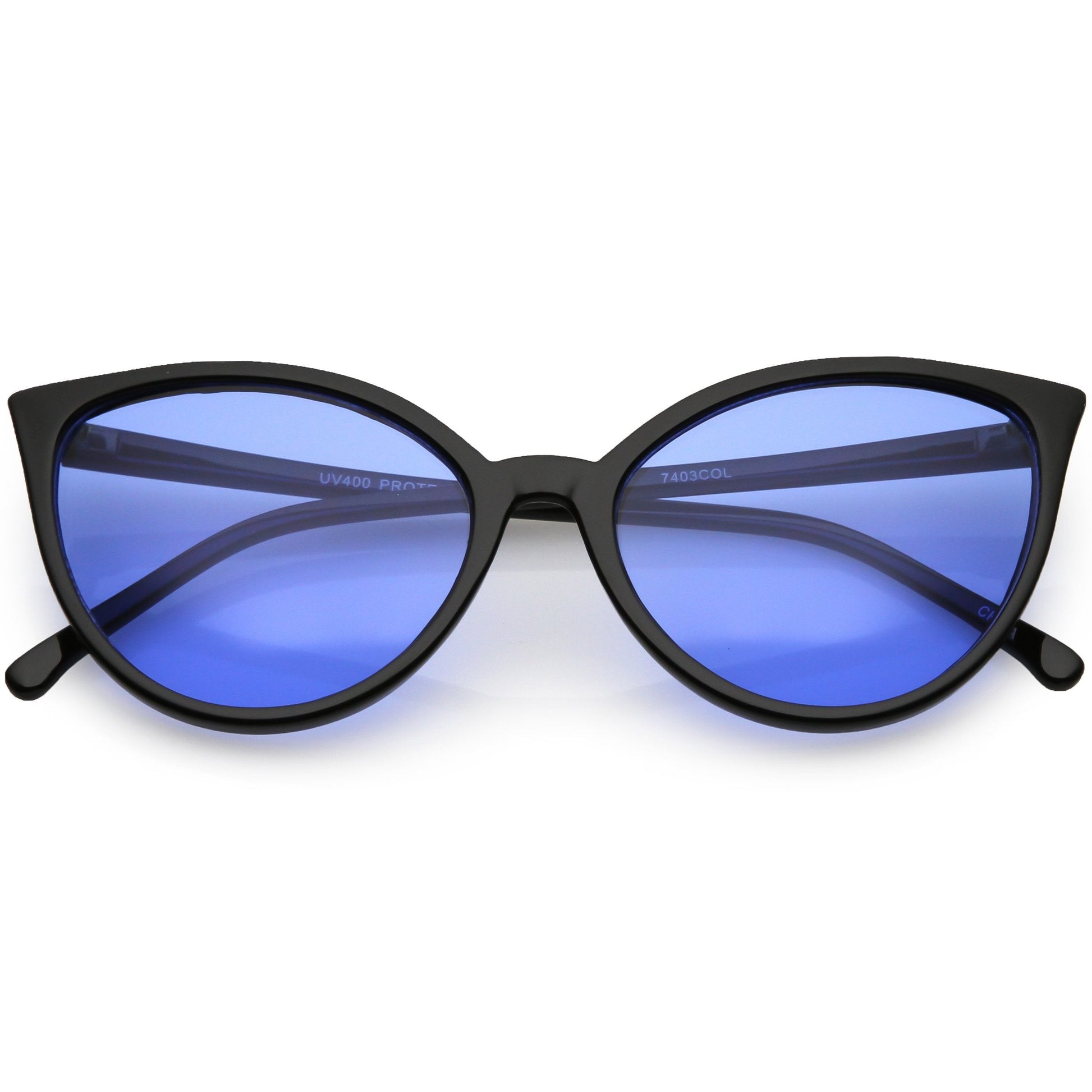 This fierce cat eye frame is the perfect statement piece for any style. Choose between five different color tinted lens to add to your accessory closet. This slim, round framed style is completed with a plastic based frame, metal hinges, and 100% UV protected lenses.